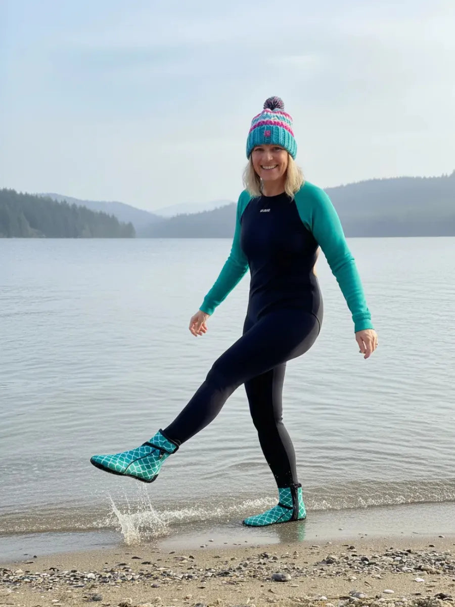 Off in seconds with cold fingers. Neoprene swim socks made for wild swims and ice baths.